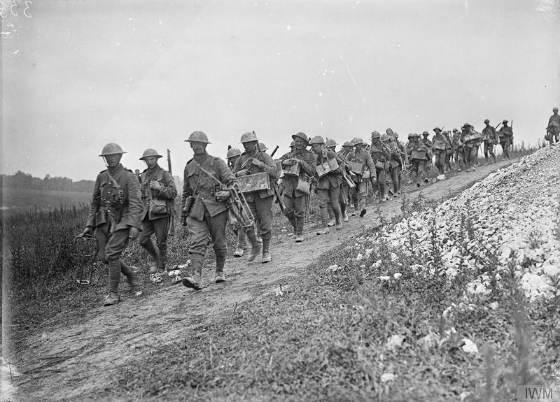 A bomb carrying party of the 1st Battalion, Sherwood Foresters going up to the front line at La Boisselle, France, 6 July 1916. (c) IWM Q780
