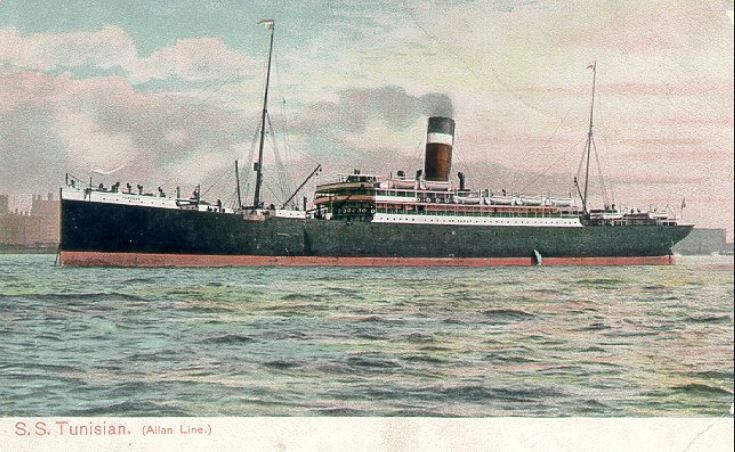 HMT Tunisian, built for Allan Line. In early 1916 assisted with the relocation of the Australian Imperial Force from Alexandria to Marseilles.