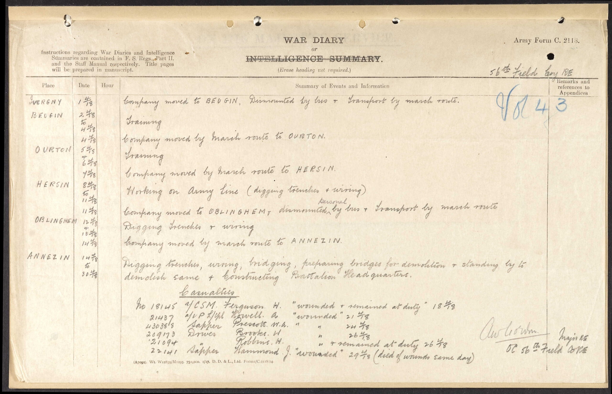 Joseph joined the Royal Engineers at the beginning of the war, and with his technical skills was quickly posted to France, where there was a shortage of technical troops. He landed in France on 20th November 1914. For much of the war he served with 56th Field Company, part of the regular army, 3rd Division [2].